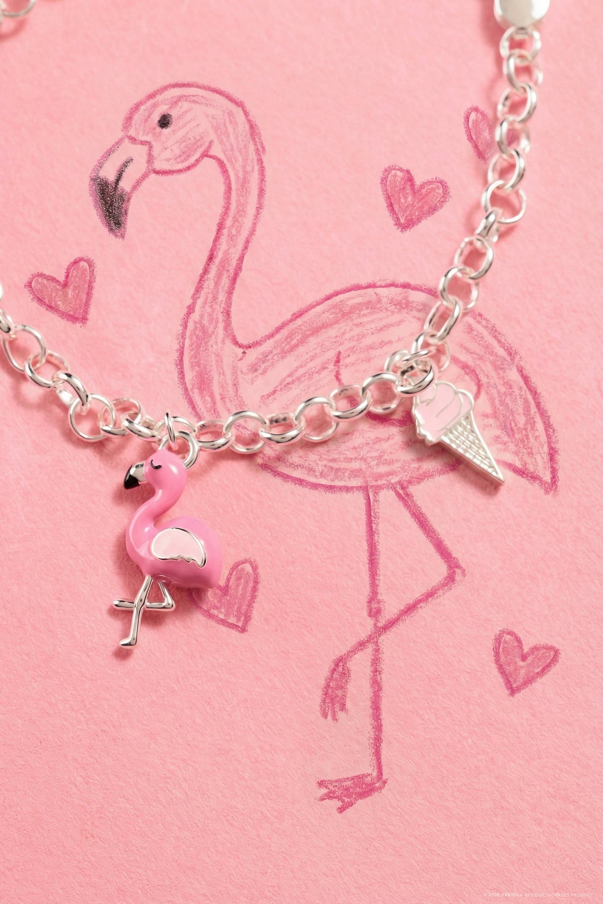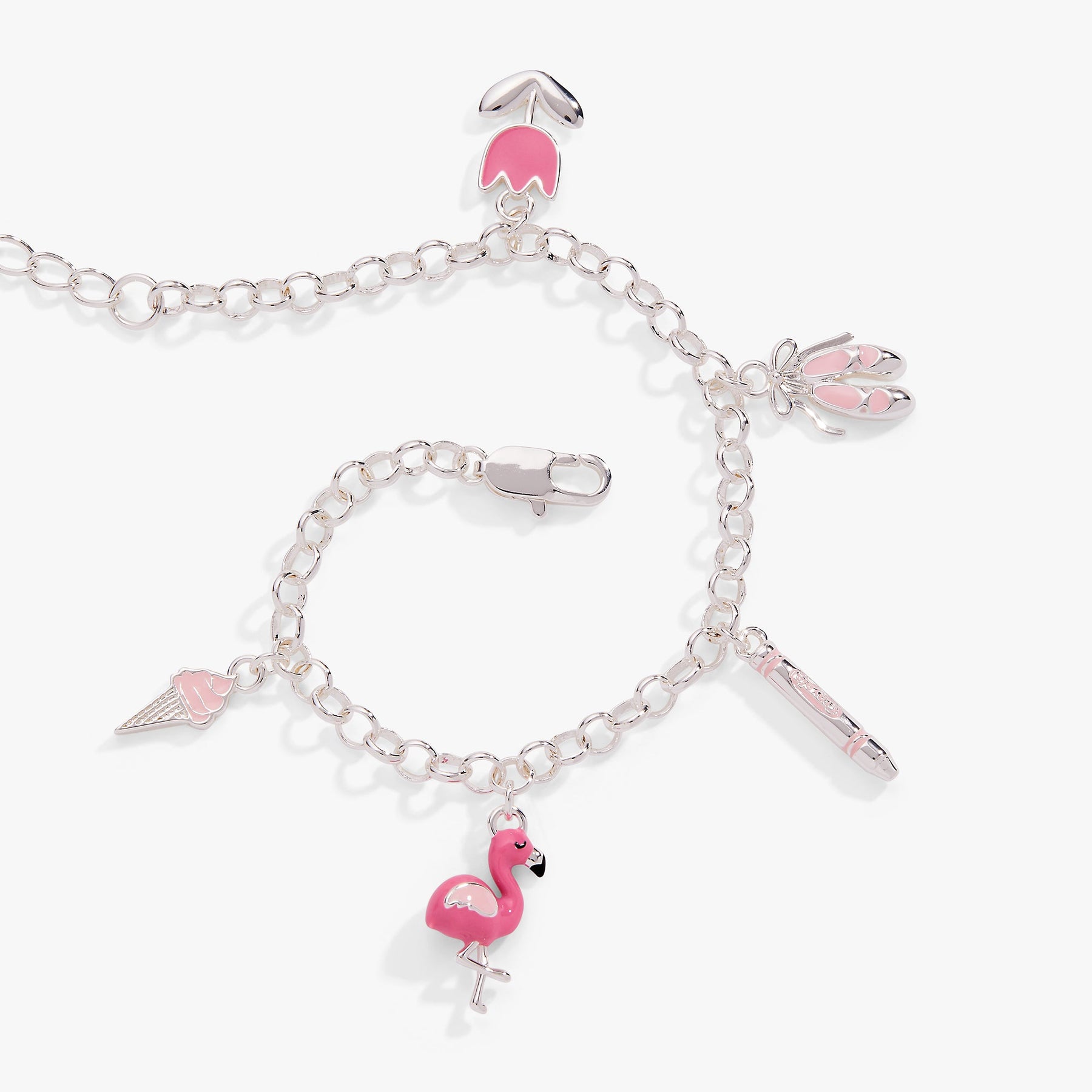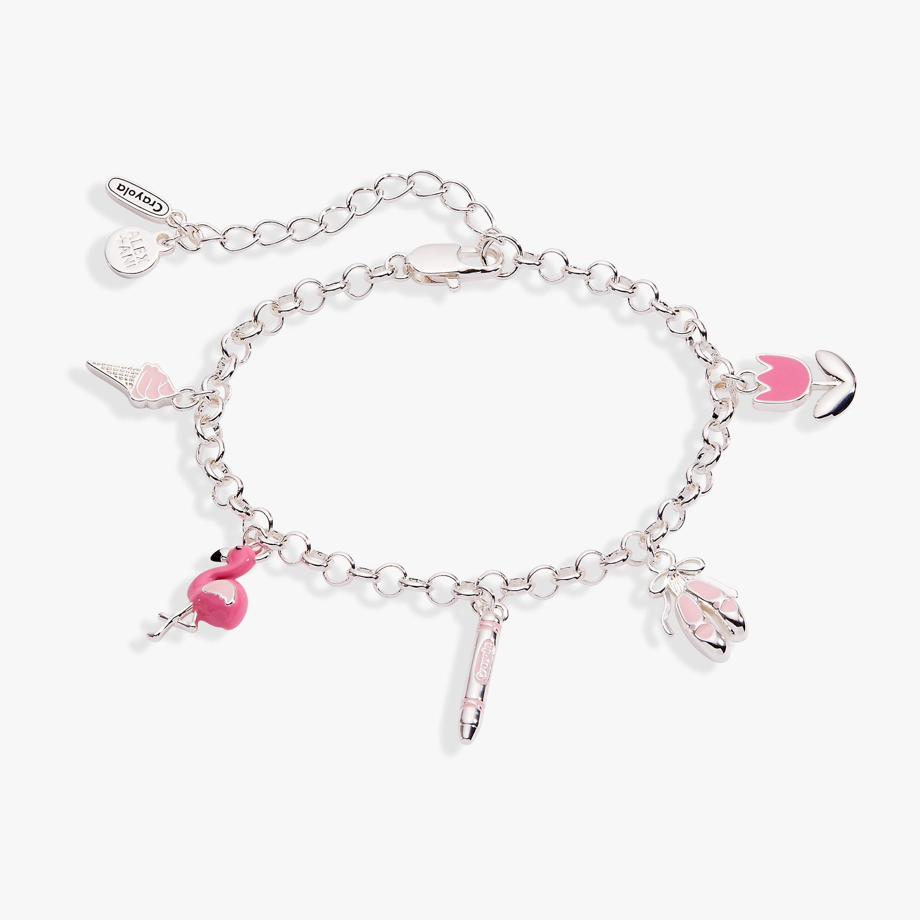 Slip on this delightful chain bracelet adorned with five whimsical enamel charms that celebrate all things pink and fun. From a cheerful flamingo and twirly ballet slippers to a sweet ice cream cone, sharpened pencil, and blooming tulip, each charm tells its own colorful story. Perfect for expressing your playful personality and love of iconic Crayola colors. This exclusive collaboration between Crayola and Alex and Ani brings nostalgic charm to your wrist. Each carefully crafted enamel charm captures the vibrant spirit of the beloved Tickle Me Pink shade, making it an instant conversation starter. Whether you're a longtime Crayola fan or simply love bold, joyful accessories, this bracelet is the perfect way to add a pop of personality to any outfit. Stack it with other favorites or wear it solo for maximum impact.