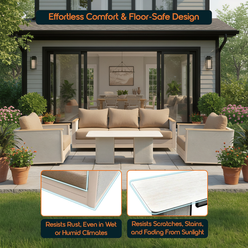 Built to outlast trends and tough weather, the Arvin 4-piece conversation set delivers lasting comfort with a clean, modern edge. The aluminum frames provide strong support and resist rust, while the sintered stone coffee table adds a solid, low-maintenance centerpiece. Upholstered in durable polypropylene and olefin, each seat includes foam cushions and floor-protecting glides that is designed for everyday ease, indoors or out.