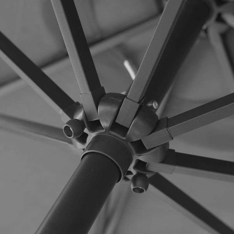 The umbrella features 24 solar-powered LED lights embedded along the canopy ribs, delivering eco-friendly evening lighting without requiring electricity or cords. A rechargeable battery powered by the top solar panel includes an ON/OFF switch for convenient control. The crank mechanism offers smooth and effortless opening and closing of the canopy. The push-button tilt feature allows precise adjustment of the canopy angle, enabling customizable shading to suit varying sunlight conditions throughout the day. The canopy is crafted from water- and fade-resistant polyester fabric designed to withstand outdoor conditions. This high-performance material resists moisture and prevents color fading from prolonged sun exposure. It maintains its strength and structural integrity for reliable long-term use. The frame is made with an anti-rust powder-coated steel pole and supported by 8 strong steel ribs. The materials are designed to resist rust, bending, and wear, ensuring the structure stays durable and reliable in outdoor settings. The umbrella includes ties to securely fasten the canopy when not in use, ensuring it stays in place during storage. These ties prevent unwanted movement caused by wind or handling. This feature helps maintain the canopy's position and protects it from unnecessary wear. The umbrella works with most heavy bases (not included) to provide secure and stable placement. Its design includes sturdy construction that fits common outdoor bases, offering reliable support for use in a variety of outdoor settings. The umbrella features a simple assembly process, designed with clearly labeled components for intuitive setup. Its durable materials resist wear and allow easy cleaning, ensuring long-lasting use in outdoor settings such as patios, gardens, decks, and poolside areas.