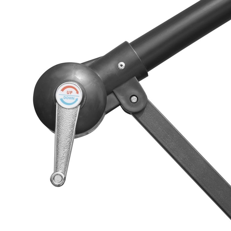 The innovative offset pole design provides open space beneath the canopy, allowing flexible furniture arrangements without the interference of a center pole. Features 24 energy-efficient LED lights powered by a solar panel on top, eliminating the need for electricity or cords. A built-in on/off switch ensures effortless control of the lighting, perfect for evening use. A 1.9-inch diameter steel pole and eight steel ribs with a powder-coated finish ensure superior durability, rust resistance, and stability for enhanced outdoor performance. A user-friendly crank mechanism allows quick and effortless opening and closing of the umbrella. The locking lever provides added security and maintains the desired position. The canopy uses durable polyester fabric with a tightly woven design that provides resistance to UV rays, fading, and water exposure, ensuring it holds up well in outdoor environments. Integrated ties are designed to hold the umbrella securely in a closed position. The durable construction of the ties ensures they keep the umbrella stable and properly secured when it is not in use or during storage. A heavy base (not included) is required for the umbrella, designed with compatibility for various outdoor setups. The sturdy construction of the umbrella works effectively with a weighted base to ensure proper functionality in outdoor environments.